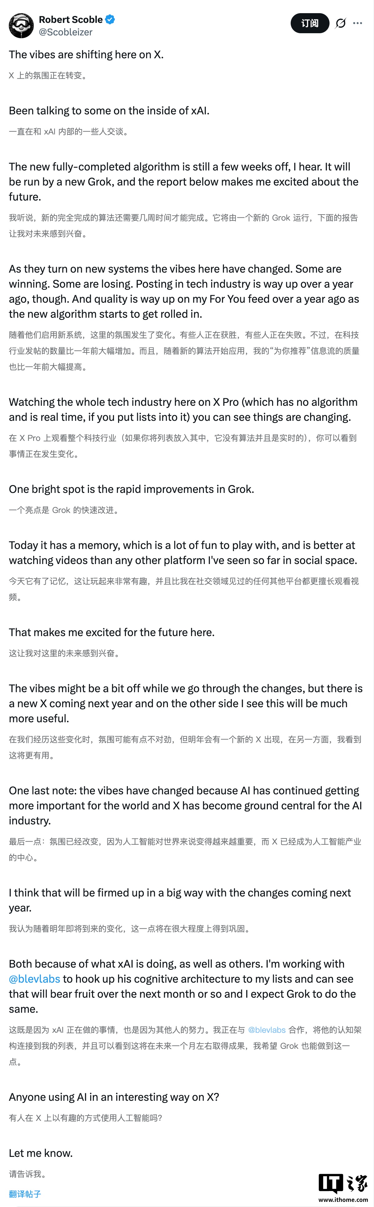 不仅因为 xAI 在做什么,也因为其他团队的贡献。我正与 @blevlabs 合作,把他的认知架构接入我的列表,看起来未来一个月会看到成果,我预计 Grok 也会如此。