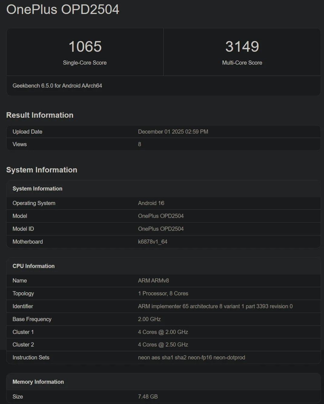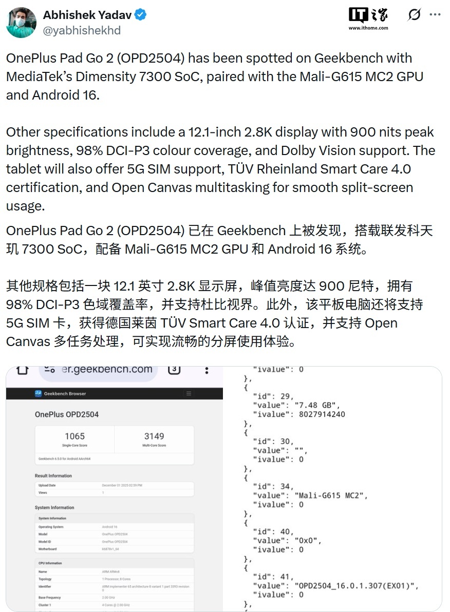 结合此前援引 NoteBook Check 报道,一加 Pad Go 2 平板已现身 Geekbench 跑分数据库,搭载一枚八核处理器,配备四颗 2.5GHz 大核、四颗 2.0GHz 小核,以及一颗 ARM Mali-G615 MC2 GPU 和 8GB 内存,单核 / 多核分数分别是 1065 分 / 3149 分。