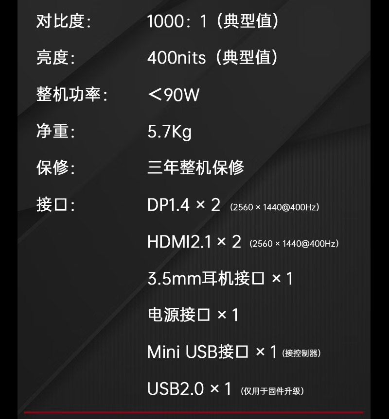 从商品页面获悉,这款显示器采用了“Ultra Fast IPS”快速液晶面板,支持 400Hz 刷新率(原生 360Hz)、六轴精准调色、5 档位 OD 调节,配备防眩光遮光罩、幽灵收纳耳机架。