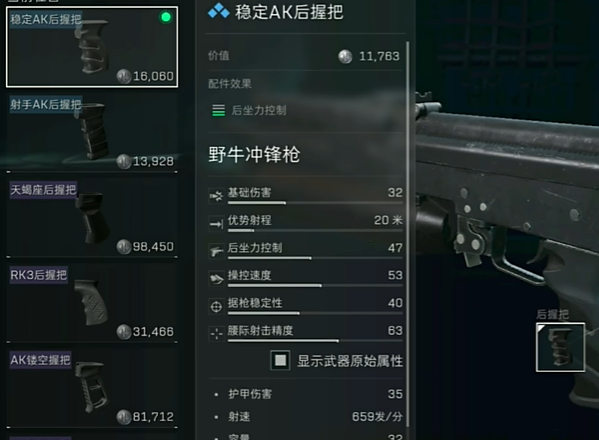 1、握把:稳定AK后握把,可以增加4%的后坐力控制,压枪更稳定。