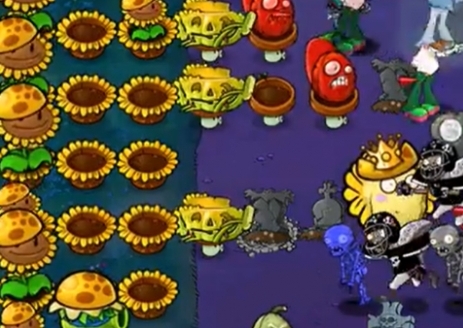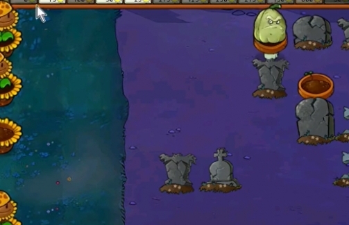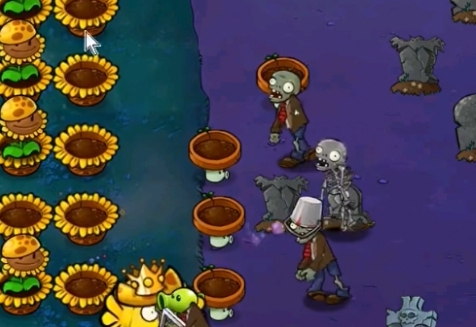 2、先在左侧种植一列阳光向日葵,在右侧的墓碑旁边种植三个小盆菇。