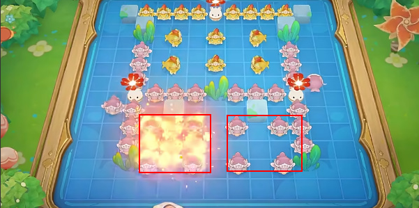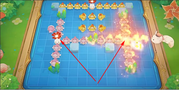 4、然后将将嘟嘟可切换至右侧,投掷一颗红色炸弹炸掉清理最后的一波角角鱼就通关了;