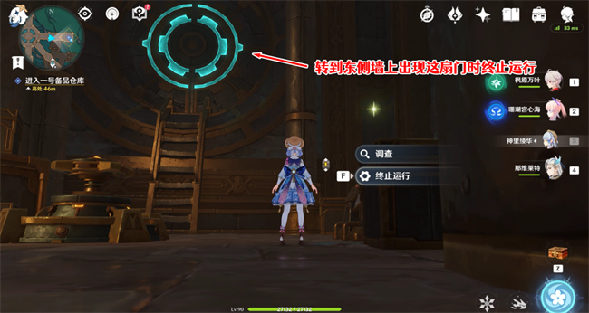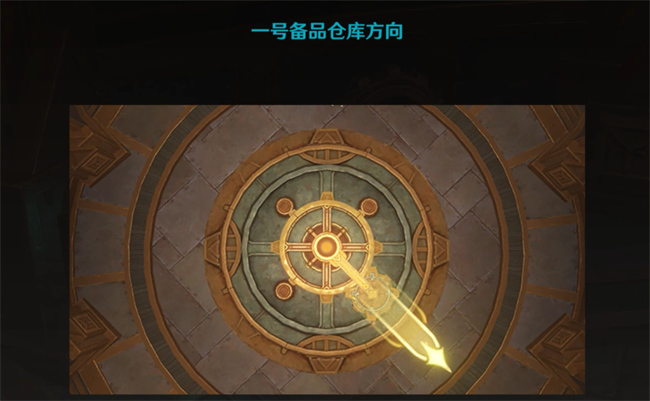 7、中间的「齿轮传动器」会旋转,在指针指向东边通道时终止运行,进入一号仓库的门会打开(也可以直接看东墙上的入口,转到下图这个亮起的门时即可终止)。
