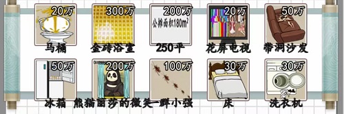 马桶、金砖浴室、250平、花屏电视、带洞沙发、冰箱、熊猫丽莎的微笑、一群小强、床、洗衣机