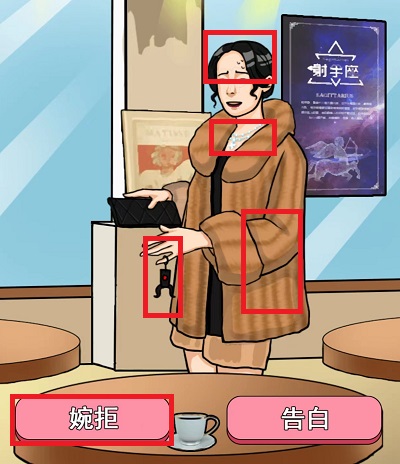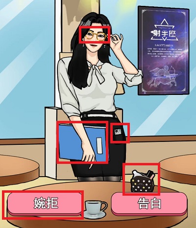 在本关卡中我们将与四位女生进行相亲,需要根据每个女生的形象,从中选对正确的人进行告白,也就是最后一个女生,但是需要注意一定要点击星座海报才能告白,不然会因为没有共同话题而失败。