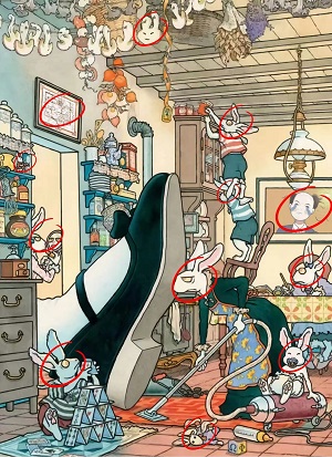 1、首先我们将图中非常明显的几个兔子人找出来,一共有7个,而我们一共需要找出12只兔子;