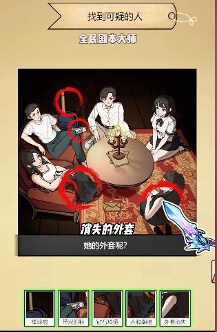 3、接着要找到可疑的人,点击棒球棍、带泥的鞋、衣服潮湿、钻石项链、外套消失