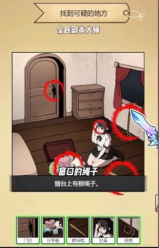 2、然后点击门锁、绳子、棒球棍、行李箱、受伤的女生