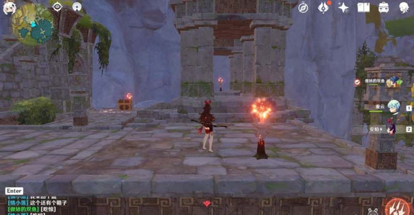 2、第一个宝箱需要岩元素,并把所示的灯踩一遍,踩到爆炸的灯即可解锁机关,用岩元素开启宝箱。