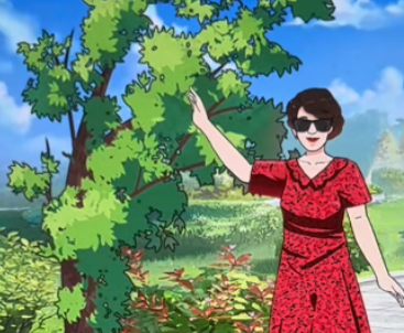 妈妈:红色碎花裙+墨镜+树,再把掰树枝姿势给她,点击相机。