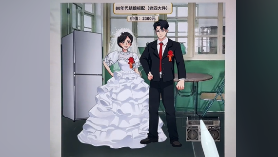 80年代:蛋糕裙婚纱+冰箱+洗衣机+录音机+黑白电视。