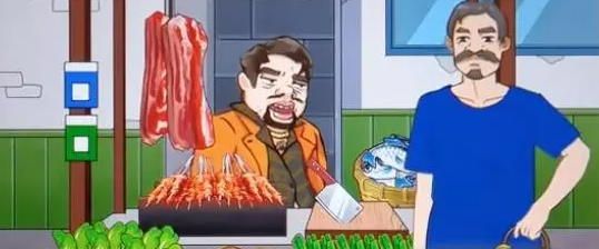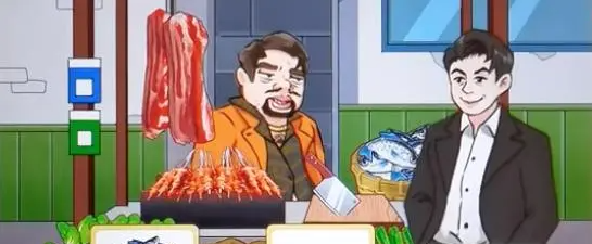 第五个顾客:两个都不要选,拖动场景里的刀到鱼上,案板上出现切好的鱼肉,把鱼肉给顾客,再移动葱给他。