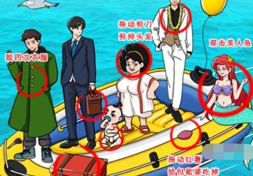 1、就我眼神好海上遇险,需要帮救生船减重,首先拖动绿色棉衣人的衣服,向下拖动四次