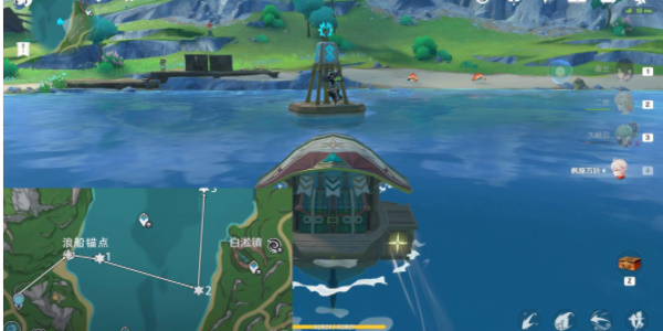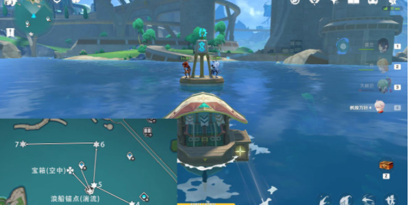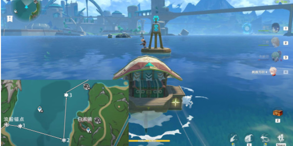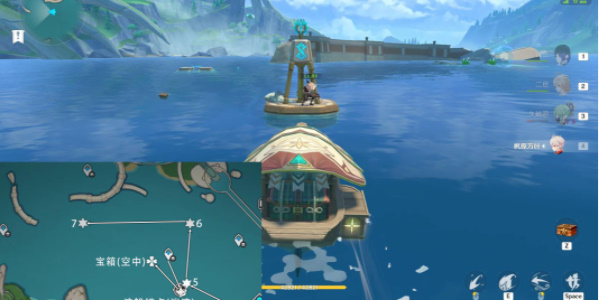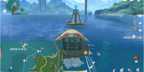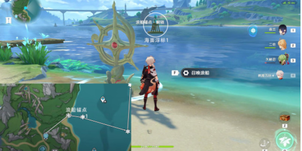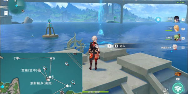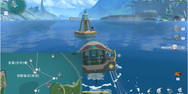 传送到苍晶区神像,召唤浪船往地图的东北方向开,击败海面浮标1上的丘丘人。
