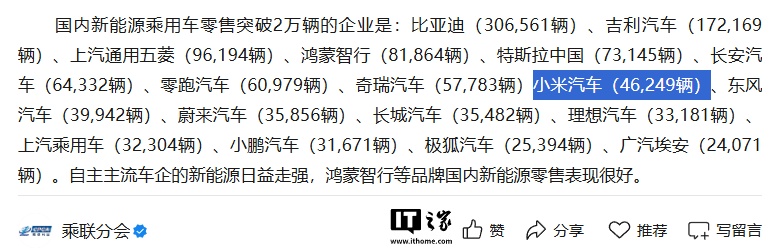 小米汽车官方并未公布具体的交付数据,不过在乘联分会今日公布的 2025 年 11 月份全国乘用车市场分析中,找到了其具体的销量情况,其中,小米汽车新能源乘用车零售 46249 辆、YU7 车型批发销量超三万辆(33729 辆)。