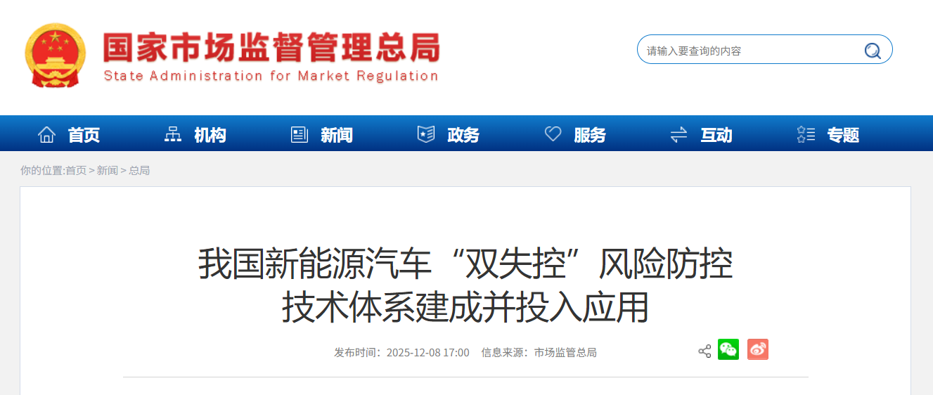 12 月 8 日消息,据国家市场监管总局官网今日消息,针对新能源汽车热失控和速度失控构成的“双失控”行业痛点,市场监管总局组织国内优势科研力量,通过“双失控”事故深度调查与缺陷判定技术研发,结合“线上预警 + 线下检测”一体化风险防控机制,加之“新能源汽车智慧监管云平台”的统筹赋能,构建起新能源汽车“双失控”风险防控技术体系并投入应用,为提升召回监管科学化水平、保障消费者人身和财产安全提供了技术支撑。
