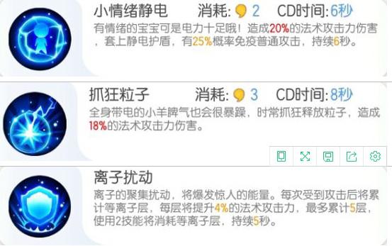 2技能:抓狂粒子,全身带电的小羊脾气也会很暴躁,时长抓狂释放粒子,造成18%的法术攻击力伤害(CD8,耗豆3);
