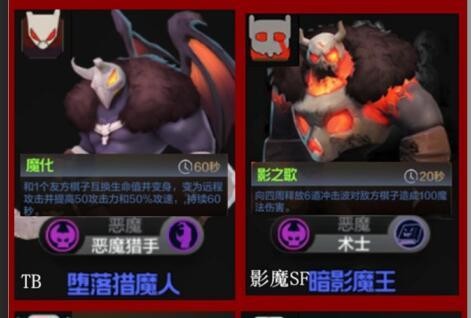 打法推荐:这套阵容搭配比较灵活,不要玩的太死板,打这套,你需要看对手拿了什么恶魔,他没拿什么你就拿什么,这样更容易三星,恶魔三星还是很关键的,但是禁忌猎魔人和堕落猎魔人是必拿的,其他的看对手,我自己不太喜欢女王,虽然特别容易三星,但是我总是感觉她在演我,老是周围没人的时候放技能打假赛emmm,言归正传,这套阵容中期最好搭配个不眠来配合堕落猎魔人打输出过渡,推荐拿邪灵骑士加灵魂收割者,因为这个阵容如果中期过渡的不好可能被直接抬走,所以可以搭配点羁绊卡。