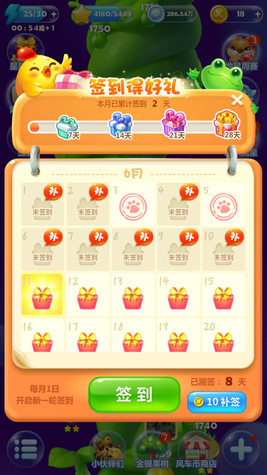 在每天登陆游戏后,进行签到。累计签到天数达到标准即可获得30分钟的无限精力。