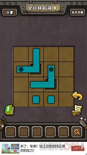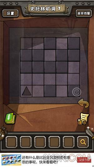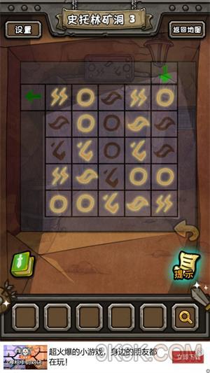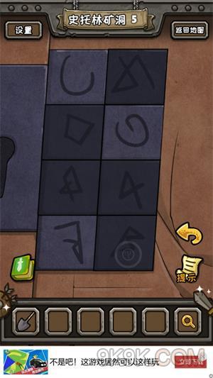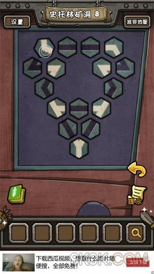 4.左下角的保险柜,把两个小正方形,放在被弯形盖住的孔中,很简单,点一下弯形的小点点,就自己自动开位置了。打开柜子后得到轮子,轮子给矿车,然后点击矿车的符号即可,矿车撞开大门。