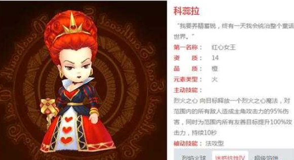 在有杀气童话游戏中,有一位排在后方远程控场,输出技能全部是范围群攻,可以为团队提升20%攻击力,又能100%触发对敌方的范围击晕效果,是团队中不可或缺的群攻DPS,但是自身的防御能力不强哦! 她是谁呢?她就是红心女王科蕊拉,我们一起来了解一下吧!