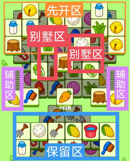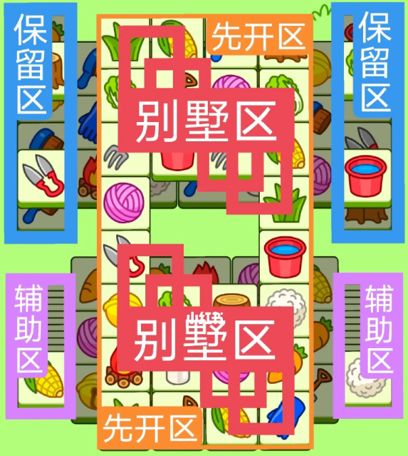 一个T字型大别墅,一个方形大别墅。开局先消除橙色区,这里压牌比较多,然后按照一层层均匀消除表面牌,不要跨层太多拿牌,必要时可以用盲盒区辅助消除表面牌,尽量还是以别墅区内互相消除为主,蓝色区基本都是明牌,全部保留到后期使用。