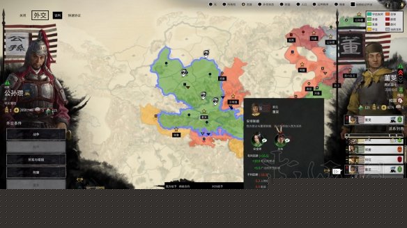 除董卓任何势力开局,大家先按自己的思路攻城掠地,等触发董卓已死董旻继任的剧情,直接与董旻谈合并附庸,开启全图外交,接下来开始表演。