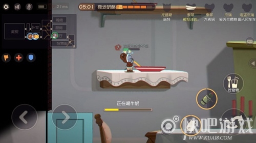 如有玩家站在冰面上,会受到冰面的影响被滑走。因此,猫猫将冰块丢在火箭下,能够起到限制老鼠走位的效果,老鼠必须跳跃至空中才能解救队友;当然,猫猫也可以丢下叉子,叉子会插进地面对老鼠形成阻挡,老鼠就无法滑走了;