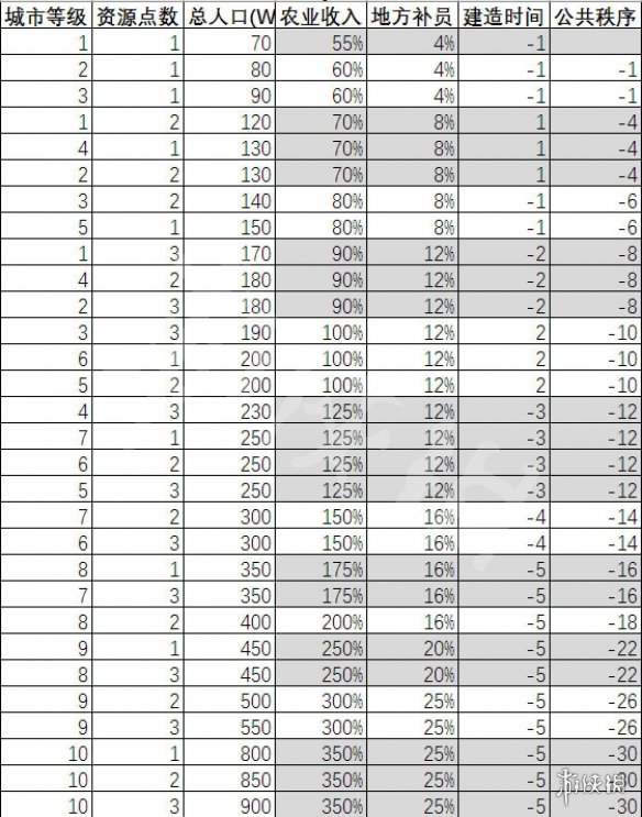 第六个格子:对于同时存在农业村和城市港口的郡县,可以升级到8级城市,因为城市比小城耗粮多了8,但是官服支持建筑可以提供15/18的粮食加成。但是注意,如果是江阳、苍梧这种带3个村的郡县,人口会到450w,需要把官服支持换成孔庙