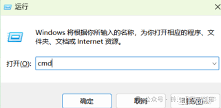 2. 在对话框中输入“cmd”,然后点击“确定”按钮,打开命令提示符窗口。