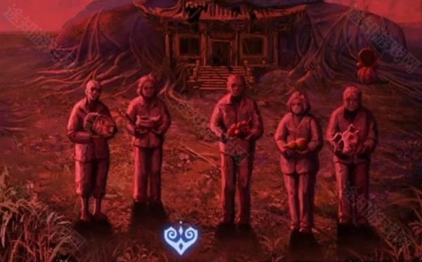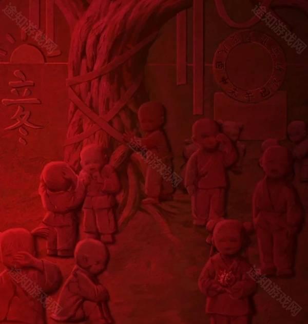 然后切换到红色,地上拿到【红灯笼】,半截石碑里拿到【头像】,向后转雕像上的字都是线索,颜色和位置都需要记下来,后面用到的时候详细说,把【灯笼】交给右下角的村民后就能看剧情了,剧情过后记下来村民手里的贡品从左到右【人头-盆-葡萄-葫芦-猪头】,不过因为这两世界可能是镜像,所以用的时候也可能是反着的。