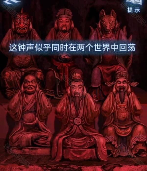 切换到白色看剧情,原本蒙着布的雕像手里出现了物品,能拿到的是第一排第三个的【法器】和第二排中间的【扇子】,拿到后查看一下钟的位置,出现了很多铃铛,把我们前面拿到的【铃铛】也挂上去后钟再次响起,下面的是线索记下来从上到下【扇子-铜钱-木鱼-木板-铜钱-法器-碗勺】。