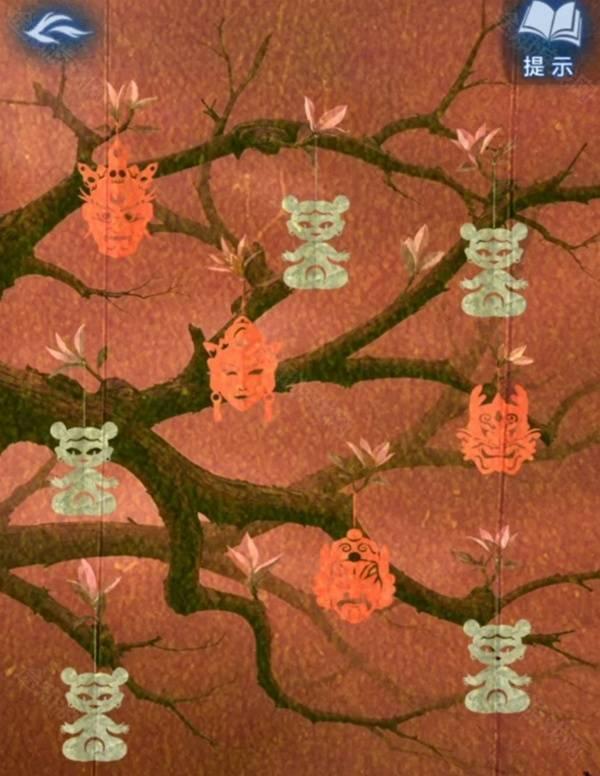切换到红色场景,出门后后退一下看剧情,剧情后查看树上,我们的两个世界是镜像的,也就是我们需要结合白色世界树上的娃娃和傩面位置,找不到的直接往上翻看截图,或者直接看答案如下图哦,完成后继续看剧情,剧情过后树上长出一个【木娃娃】。