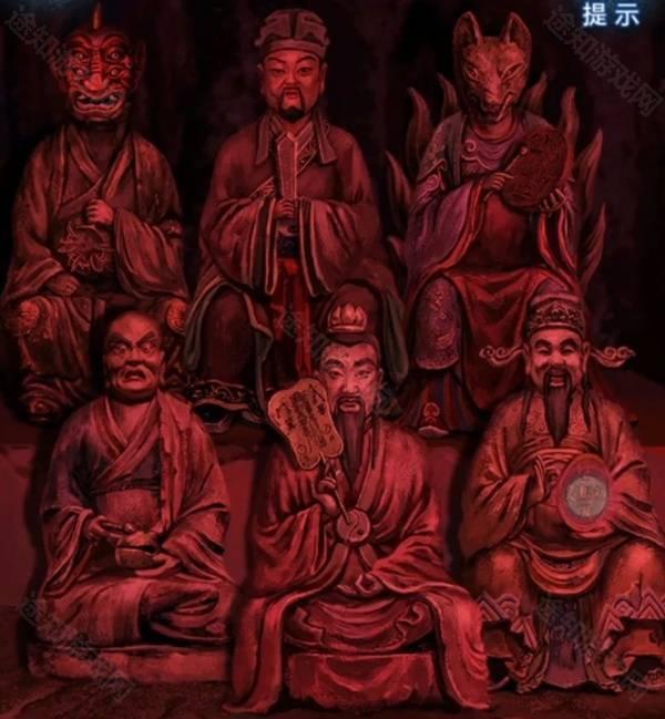 查看一下中间的供桌,对左边的酒杯使用【酒葫芦】,然后查看右边的墓碑,将【玉雕】放在墓碑中间位置就能移开所有墓碑了,移开后在地上拿到【大铜钱】,在墓碑上面拿到【布带】,后退一下来到有神像的庙,把大铜钱放在最右边的神像手里就能开始奏乐了,这里直接公布答案了,因为从上往下的顺序是【扇子-铜钱-木鱼-木板-铜钱-法器-碗勺】,所以这个我们试一下发现是从下往上的,其实钟上面也有个向上的箭头,所以算是有提示的,顺序为【右上-左上-右下-上中-左下-右下-下中】,完成之后拿到【三牲】。