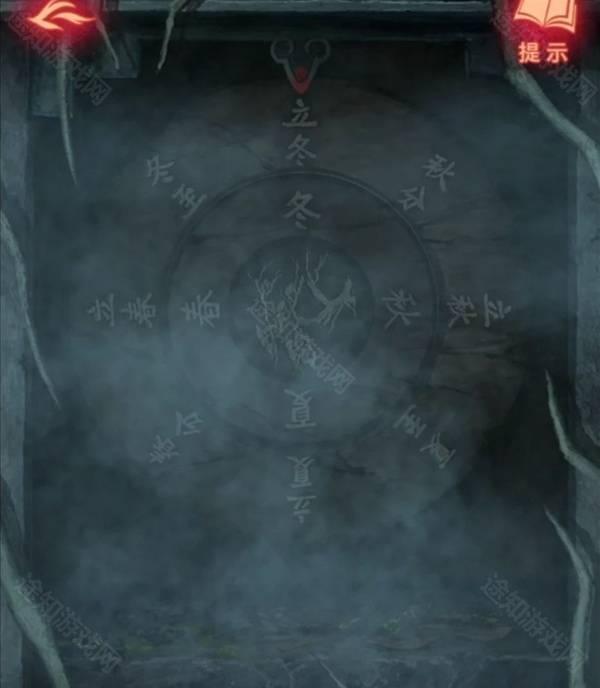 第一个玩具提到如山中孤兽,所以就放入【老虎玩偶】,第二个希望羽化仙,所以放入个有羽毛的【毽子】,第三个是兵灾,所以放入武器【小木刀】,第四个希望啼哭三声,所以放个能响的【响球】,最后一个要乘车升天,那放个车【鸠车】,都放好后血雾消失,查看左上角的图画记下来【立冬】,画太阳的位置向右边延伸,影子应该落在【卯】上面也记下来。