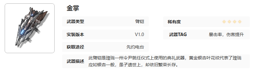 鸣潮武器金掌培养材料是什么?金掌是4星武器,类型为臂铠。此臂铠是瑝珑一州令尹就任仪式上使用的典礼武器,施放共鸣技能时,会提高自身共鸣解放伤害。那么接下来就跟着小编一起来了解一下《鸣潮》武器金掌培养材料一览。