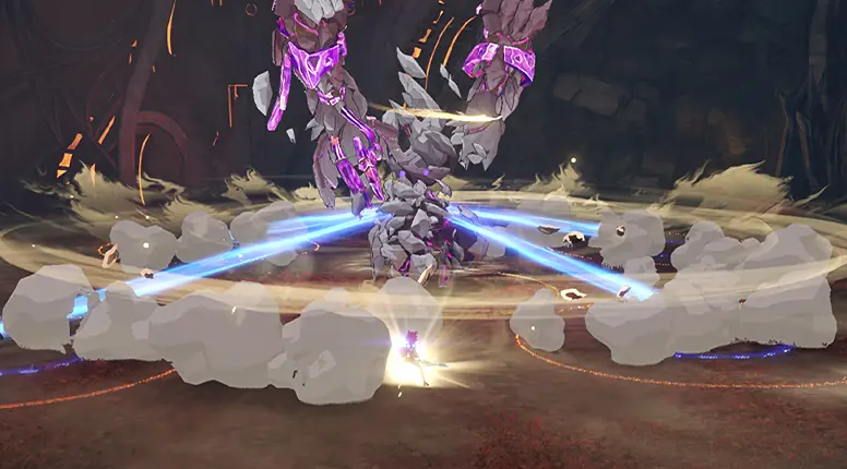 “裂石风暴”为持续性环境压制技能,Boss旋转释放环状沙尘气流,不断将玩家向外推动。部分区域推送力极强,可致角色跌出平台边界。应对策略为迅速向最近的遗迹装置靠拢,并严格站位在装置投射的蓝色增益圈内——该区域提供显著移速加成,配合主动向Boss方向移动,可形成速度抵消,有效规避坠落。场地内存在的石柱、断壁等结构亦可作为卡位点使用。