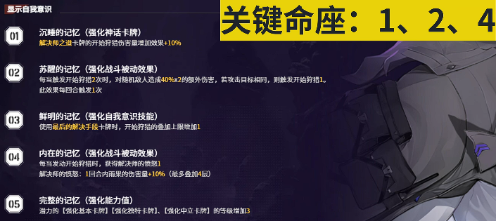 0命的小春和2命的小春用起来手感是完全不一样的,再包括相对比较冷门的路克其实也是同样的道理,那么对于这种提升能力非常大的命座,就是其中的关键命座,那么这类命座的提升,大概也是分为四类,首先就是强化自身的神化卡牌,第二类也是最多的,就是强化战斗被动卡牌的效果,这一方面其实就包括了其中机制的拆分,第三类则是强化自我意识技能,也就是需要消耗能量的大招,那么第4类则是不太关键的强化能力值,目前每个角色的五命都是强化能力值,所以说大家要重点根据强化战斗的被动效果来进行判定。
