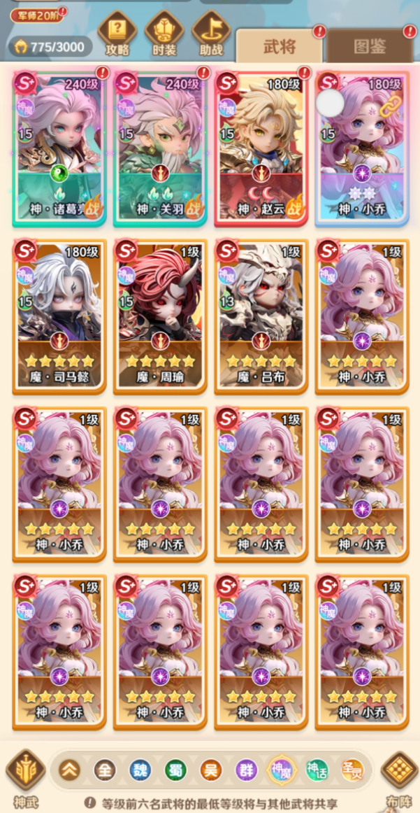 其实在巨神军师游戏当中,还有一个神魔混搭的阵容,这个阵容相对来说是比较强悍的,也具备一定的全能性。在这里选择的武将是关羽、吕布,诸葛亮,小乔,貂蝉,吕玲绮。这些角色直接搭配在一起,就比如说魔性的吕布,他的伤害要比普通的吕布高很多,关羽还是负责收割,这样就能够形成双核的爆发体系。诸葛亮能够提供怒气值,小乔跟貂蝉可以强化控制跟护盾的容错率。