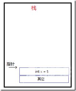 2、开始执行AddFive()方法,值类型变量pValue被放到"栈"上,并把x的值赋值给pValue,pValue的值变成了5。