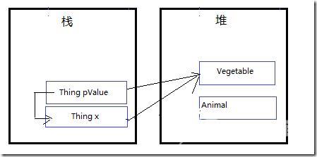 4、在Switcharoo(ref Thing pValue)内部,在托管堆上创建Vegetable对象实例。5、pValue指向Vegetable实例,也就相当于x指向Vegetable实例。