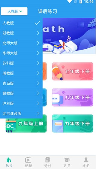 初中数学助手app有哪些功能,首先用户需要在本网站下载安装好这款软件,在线选择自己学习的教材版本,人教版,浙教版,北师大版等等,选择好之后可以看到其中的内容与书上的信息是对应的,可以自由选择练习的章节。