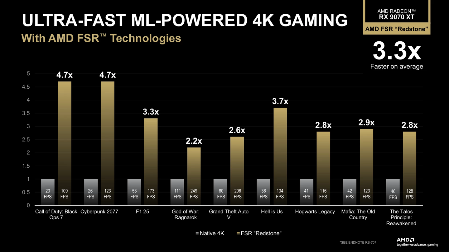 与此前按版本迭代的方式不同,“Redstone”成为 AMD 整套 AI 画质提升(Upscaling)、帧生成与光线重建技术的统称(注:今后不再以 FSR 各版本作区分)。