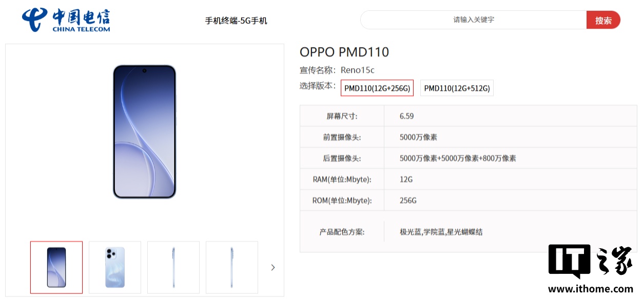 注意到,OPPO Reno 15c 手机已现身中国电信终端产品库,提供 12GB+256GB、12GB+512GB 两种存储规格,拥有极光蓝、学院蓝、星光蝴蝶结三种配色,产品零售价格尚未公布。