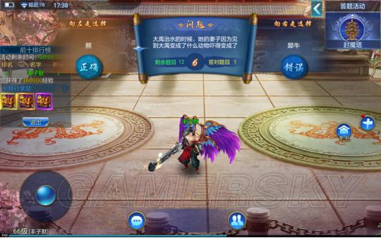 在答题时间内移动到相应答题区域来选择答案,答对一题即可获得经验奖励,活动结束后根据成绩发放奖励。
