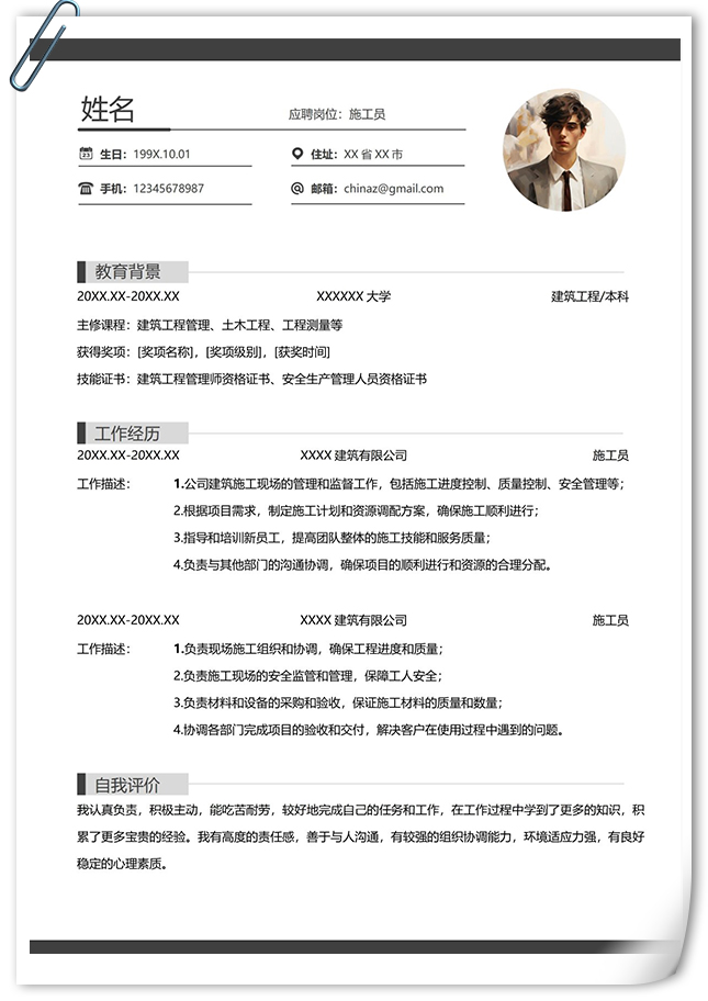 建筑工程施工员个人简历,采用纵向单排的排版布局,以灰色为主色调,整体界面简洁商务风格,模板包含基本信息、教育背景、工作经历、自我评价等模块内容,可供参考,主体文字均可替换修改,适用于工程造价、施工员、预算员、土木工程、土木工程专业、工程建筑管理、工程项目管理、建造师、造价专员等相关的个人简历主题设计应用。