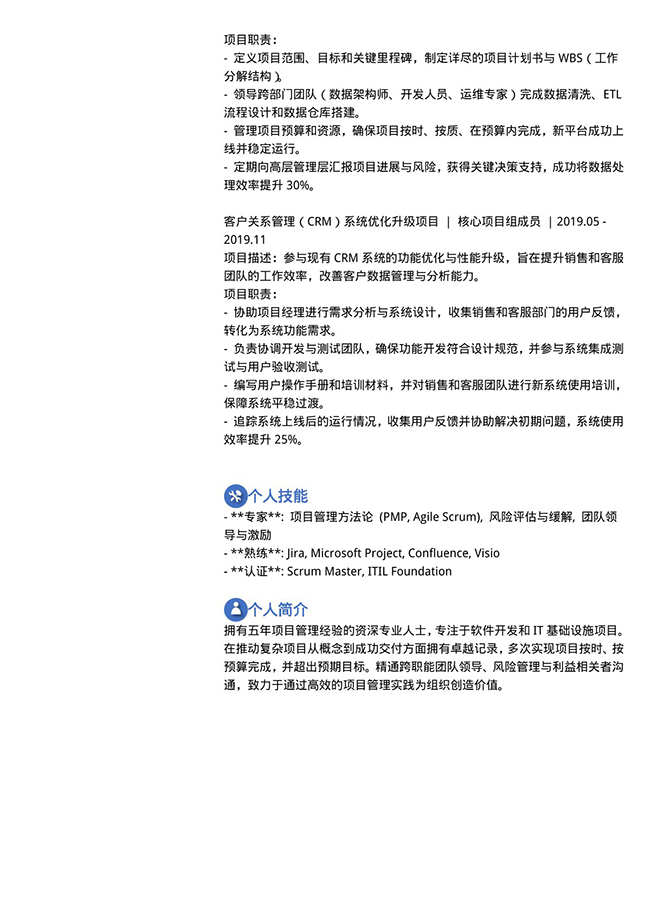 5年经验项目经理大气个人简历模板,适用于项目经理简历、PM简历、管理岗简历、通用简历、求职简历、个人简历、商务简历、找工作简历、竞聘简历等相关的个人简历主题设计应用。