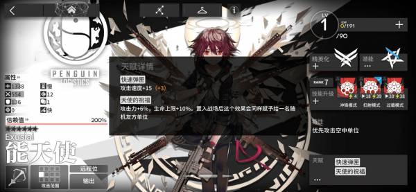 作为开服第一up池C位的能天使,可以说是明日方舟最广为人知的干员之一。能天使是一个攻速爆发流的狙击,输出溢出情况发生概率较低,技能清一色都是微提攻击连射型,在敌方普遍低甲的前中期表现极为亮眼。但对高甲对手收效甚微,甚至因此获得了抛光机的称号。然而,低费的能天使能够很早上场提供必要且充足的输出以及一定程度的,而且她的单点爆发能力在整个游戏中都是数一数二的,抽得到的话还是建议大家练起来,但鉴于其对中低甲对手的输出能力过饱和且对高甲对手输出能力偏低,建议大家练到精一40~60级。如果要精二,请在精二后将其等级尽量多提升一些。