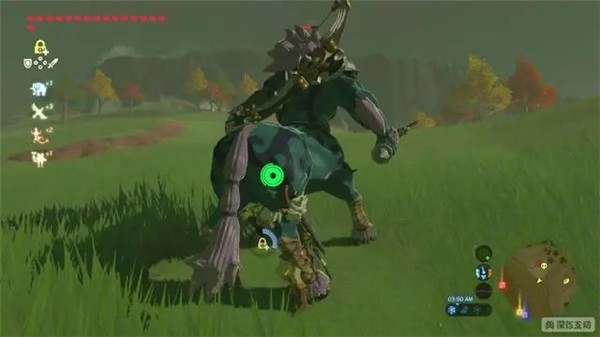 骑马的时候有一个跳跃起来的功能,先把弓箭拿在手中,然后靠近莱尼尔,在莱尼尔发现后不要慌,因为距离莱尼尔太远会被发现后立即射箭袭击,所以需要靠的近一点。靠的足够近后跳起来拔弓发动林克时间,在林克时间的状态下设计莱尼尔的头部,莱尼尔就会眩晕。