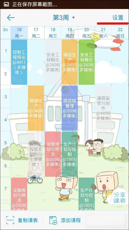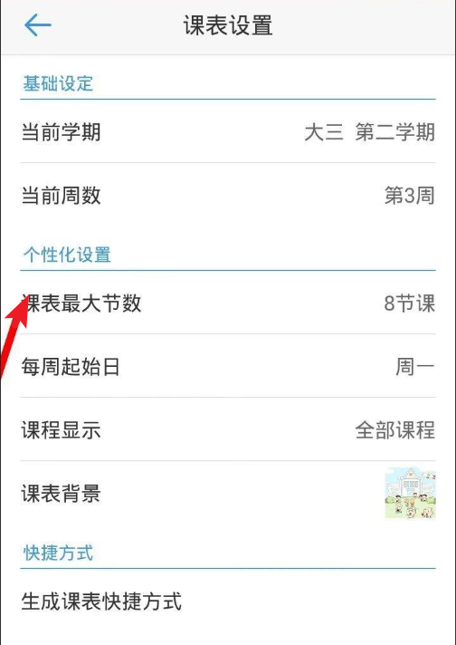 3、点击打开发现一览众的课程表,点击设置,课表最大节数,根据实际情况选择,如果你晚上没课,就选择8节课。